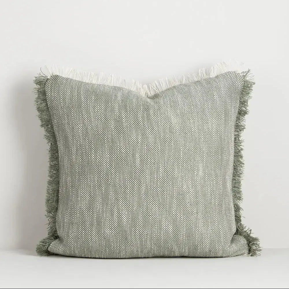 Add visual interest and dimension to outdoor settings with the relaxed design of the Caspian cushion. Featuring soft eucalyptus and ivory tones, the simple weave and two-tone fringing provides a simple, textural aesthetic for contemporary living spaces. Handwoven from soft PET yarn, this versatile piece works just as well styled indoors, especially in areas exposed to sunlight. This cushion is crafted using soft, recycled PET yarn, a resilient fibre made from recycled plastic bottles. 17 plastic bottles were saved from landfill to create this piece.