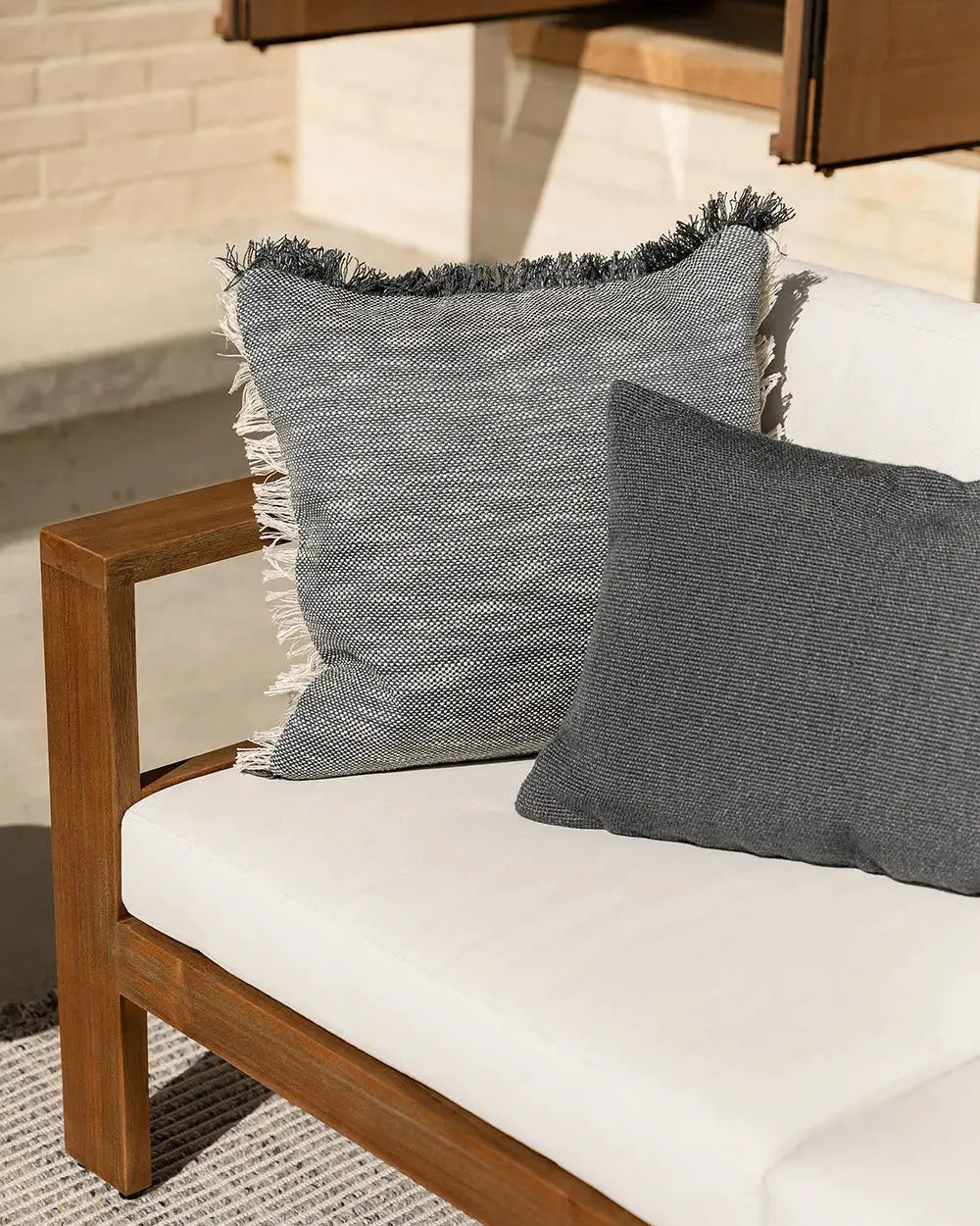 Add visual interest and dimension to outdoor settings with the relaxed design of the Caspian cushion. Featuring steel-blue and ivory tones, the simple weave and two-tone fringing provides a simple, textural aesthetic for contemporary living spaces. Handwoven from soft PET yarn, this versatile piece works just as well styled indoors, especially in areas exposed to sunlight.