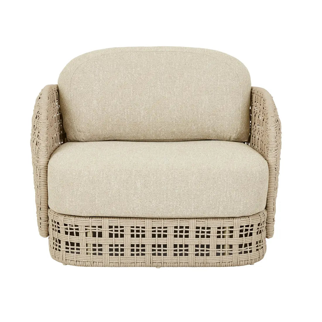 Organic curves merge seamlessly through the Cohen Sofa Chair's sculptural weave design, reflecting natural sand dune formations. Outdoor ready resin construction delivers lasting durability while quick-drying upholstery maintains year round comfort. Shell toned mushroom fabric radiates modern sophistication across gracefully curved arms, creating striking visual appeal.