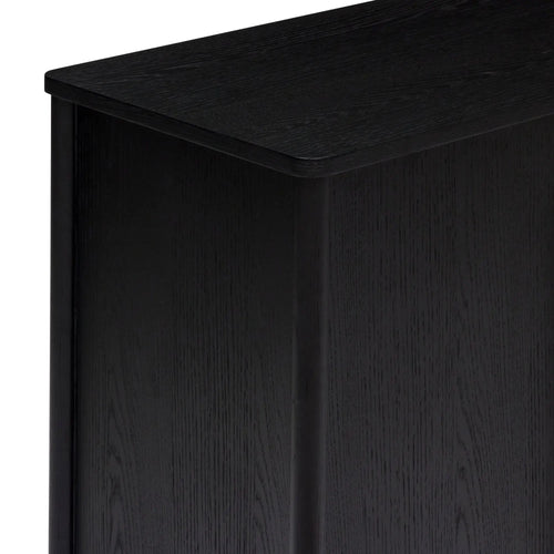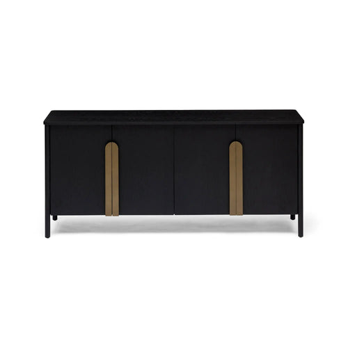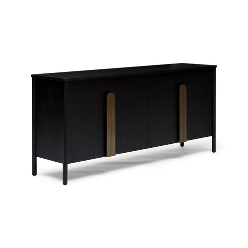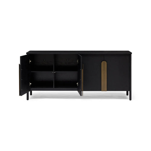 Experience the luxurious beauty of the Hemky Modern Sideboard in sleek black oak veneer. Its elegant design is enhanced by the addition of brass metal handles, making it a sophisticated storage solution. The four doors open to reveal ample storage space, with adjustable shelves for your convenience. Elevate any room with the modern sophistication and functional elegance of the Hemky Sideboard.